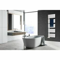 Der Design-Heizkörper Chicago mit der Abmessung 145×50 cm ist ein Badheizkörper mit exklusiven Design für Ihr Bad. Durch die Verwendung von Premium-Pulverlacken aus deutscher Herstellung wird eine exquisite Oberfläche kreiert, welche die Fingerabdrucksempfindlichkeit vermindert und gleichzeitig durch die diffuse Lichtbrechung an der Oberfläche dem Heizkörper ein edles Finish verleiht. Der Vor- und Rücklauf des Heizkörpers befindet sich unten mittig im Abstand von 50 mm. Der Heizkörper verfügt über einen ½ Zoll – Mittelanschluss (50mm) und ist für den Anschluss an Ihre Zentralheizung, Ihr Einrohr-Heizungssystem oder für den unabhängigen, elektrischen Betrieb mit einem Edelstahl-Heizstab geeignet. Im Lieferumfang sind Wandhalter, Schrauben, Dübel, sämtliche Verschlusskappen ½ Zoll, sowie ein Entlüftungsventil ½-Zoll enthalten (Mittelanschlussblöcke gehören nicht zum Lieferumfang).