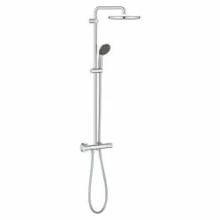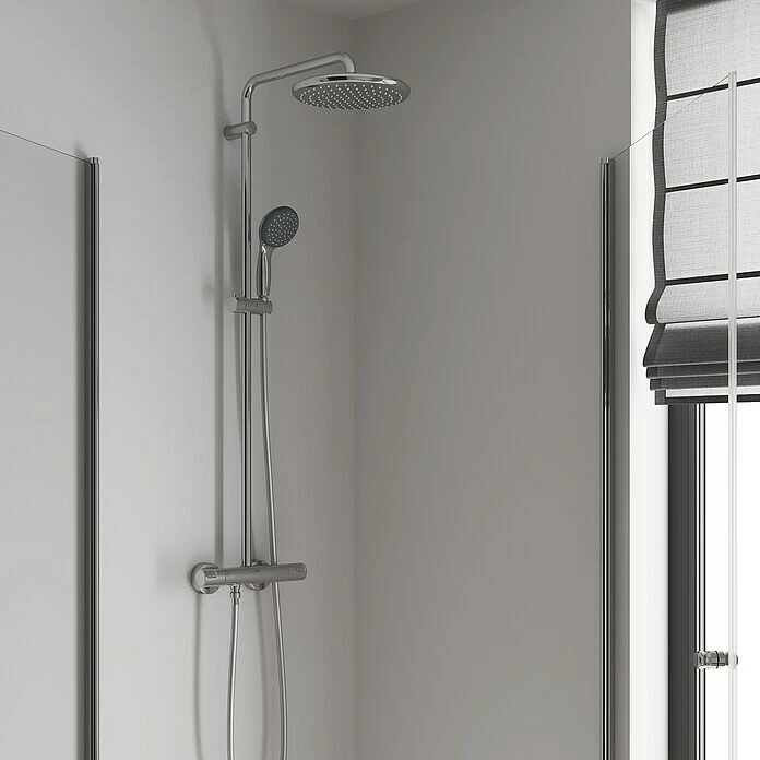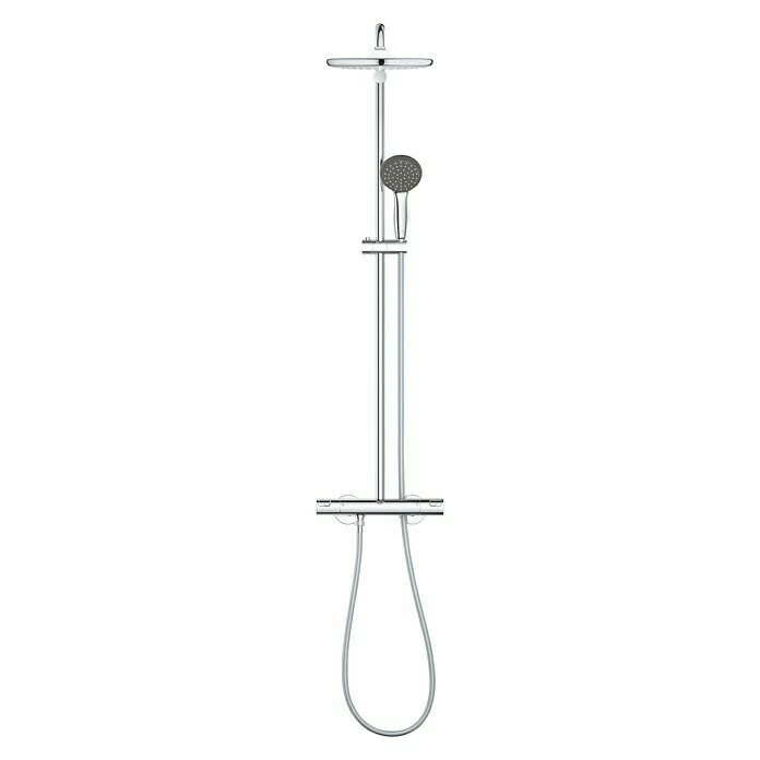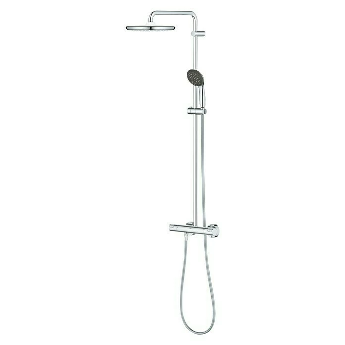 Das Duschsystem Vitalio Start 250 von Grohe ist mit Kopfbrause, Handbrause und komfortabler Thermostatarmatur ein modernes Komplettsystem aus einem Guss. Die belebende Kopfbrause mit 25 cm Durchmesser lässt sich dank des schwenkbaren Duscharms zu beiden Seiten bewegen und mittels Kugelgelenk um 10 Grad in jede Richtung kippen. Sowohl Kopf- als auch Handbrause sind mit EcoJoy-Wasserspartechnik ausgestattet, was den Wasserverbrauch um bis zu 50 % reduziert – ohne jeglichen Komfortverlust. Dank der SpeedClean Antikalk-Noppen lassen sich Kalkablagerungen jederzeit durch simples Reiben mühelos entfernen. DreamSpray sorgt im Inneren beider Brausen für eine gleichmäßige Wasserverteilung auf jede einzelne Düse. Die höhenverstellbare Handbrause mit zwei wählbaren Strahlarten ist mit einem Silikonring ausgerüstet, der vor Beschädigungen beim Herunterfallen schützt und dank eines Verdrehschutzes bleibt der Brauseschlauch stets in einer ergonomisch günstigen Position. Die StarLight Chromoberfläche liefert langlebigen Hochglanz und erweist sich zudem als besonders widerstandsfähig gegen Schmutz und Kratzer.