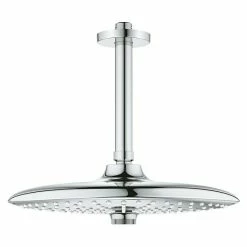 Das Kopfbrausenset Euphoria 260 von Grohe überzeugt durch ihre praktischen Eigenschaften. Sie bietet drei markante Strahlzonen, wobei das integrierte SpeedClean Antikalk-System lästige Kalkablagerungen effektiv verhindert. Um den gewünschten Strahl auszuwählen, muss die innovative Taste in der Mitte betätigt werden. Die Grohe DreamSpray® Technologie verteilt auf jede einzelne Düse die gleiche Wassermenge und erzeugt so einen angenehm gleichmäßigen Strahl. Durch den ½“ Anschluss passt sie auf jeden handelsüblichen Brausearm. Dank des Kugelgelenks ist sie auch nach der Montage, die einfach und schnell durch Anschrauben an den Arm erfolgt, schwenkbar und kann so jederzeit den eigenen Bedürfnissen angepasst werden. Der Inner WaterGuide garantiert, dass die Oberfläche der Kopfbrause niemals zu heiß wird und schützt dabei gleichermaßen die glänzende Grohe StarLight Chromoberfläche gegen Beschädigungen durch Hitze.