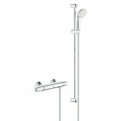Das Brauseset Grohtherm 1000 von Grohe ist eine komfortable Komplettlösung für Ihre Dusche. Es besteht aus einer Brause-Thermostatarmatur, einer Brausestange, einer Handbrause sowie einem Brauseschlauch. Die hochpräzise TurboStat Steuerungstechnologie der Brausebatterie temperiert das Wasser sofort auf die gewählte Temperatur und hält sie zuverlässig konstant – unabhängig von Temperaturschwankungen verursacht durch Veränderungen von Wasserzufuhr oder Wasserdruck. Durch die eindeutige Kennzeichnung der Armatur lassen sich Griffe und Tasten einfach und intuitiv bedienen. Die SafeStop-Funktion erlaubt Temperaturen bis 38° C und schützt auch Kinder davor, versehentlich zu heiße Temperaturen einzustellen. Bei Betätigung der SafeStop Taste ist auch eine Temperatur von über 38° C wählbar. Die verchromte Handbrause liefert auf Wunsch zwei verschiedene Strahlarten. Die DreamSpray® Technologie verteilt das Wasser gleichmäßig auf jede einzelne Düse – ganz gleich, welche der unterschiedlichen Strahlarten Sie wählen. Außerdem besitzt die Handbrause eine Speed-Clean Funktion, die durch ihre integrierten Anti-Kalknoppen lästige Kalkablagerungen effektiv verhindern. Zusätzlich ist die Handbrause mit einem Shockproof Silikonring ausgestattet, dass Beschädigungen an Brause und/oder Duschwanne beim Herunterfallen verhindert. Die StarLight® Chromoberfläche liefert langlebigen Hochglanz.