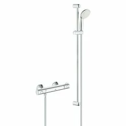 Das Brauseset Grohtherm 800 von Grohe ist eine komfortable Komplettlösung für Ihre Dusche. Es besteht aus einer Brause-Thermostatarmatur, einer Brausestange, einer Handbrause sowie einem Brauseschlauch. Die hochpräzise TurboStat Steuerungstechnologie der Brausebatterie temperiert das Wasser sofort auf die gewählte Temperatur und hält sie zuverlässig konstant – unabhängig von Temperaturschwankungen verursacht durch Veränderungen von Wasserzufuhr oder Wasserdruck. Durch die eindeutige Kennzeichnung der Armatur lassen sich Griffe und Tasten einfach und intuitiv bedienen. Die SafeStop-Funktion erlaubt Temperaturen bis 38° C und schützt auch Kinder davor, versehentlich zu heiße Temperaturen einzustellen. Bei Betätigung der SafeStop Taste ist auch eine Temperatur von über 38° C wählbar. Die verchromte Handbrause liefert auf Wunsch zwei verschiedene Strahlarten. Die DreamSpray® Technologie verteilt das Wasser gleichmäßig auf jede einzelne Düse – ganz gleich, welche der unterschiedlichen Strahlarten Sie wählen. Außerdem besitzt die Handbrause eine Speed-Clean Funktion, die durch ihre integrierten Anti-Kalknoppen lästige Kalkablagerungen effektiv verhindern. Zusätzlich ist die Handbrause mit einem Shockproof Silikonring ausgestattet, dass Beschädigungen an Brause und/oder Duschwanne beim Herunterfallen verhindert. Die StarLight® Chromoberfläche liefert langlebigen Hochglanz.