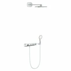 Das Duschsystem Rainshower Duo 360 von Grohe ist ein luxuriöses Duschsystem mit einfacher Bedienung und dreifacher Massage. Mit der neuartigen SmartControl Bedienung können Sie per Druck- und Drehknopf die gewünschte Brause, Strahlart und Wassermenge ganz einfach einstellen und sogar kombinieren. Zur Auswahl stehen jeweils zwei Strahlarten für Kopf- und Handbrause. So ist z. B. der Grohe TrioMassage Strahl der XXL-Kopfbrause entspannend und stimulierend zugleich. Auch in puncto Sicherheit lässt das System keine Wünsche offen: Die Grohe TurboStat® Technologie verhindert Temperaturschwankungen, die SafeStop Sperre schützt vor zu heißem Wasser und Grohe CoolTouch® sorgt dafür, dass die Armatur sich nicht aufheizt. Aber nicht nur Ihre empfindliche Haut, auch die Umwelt wird geschont: Die integrierte Grohe EcoJoy® Wasserspar-Funktion macht’s möglich! Diese und weitere praktische Funktionen sind eingebettet in ein formvollendetes Design. In Kombination mit diesem Duschsystem kann das Grohe Rainshower 360 Rohbauset für das Kopfbrause-Set und der Grohe Unterputz-Einbaukörper für Thermostat Auf-/Unterputz Kombination verwendet werden.