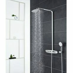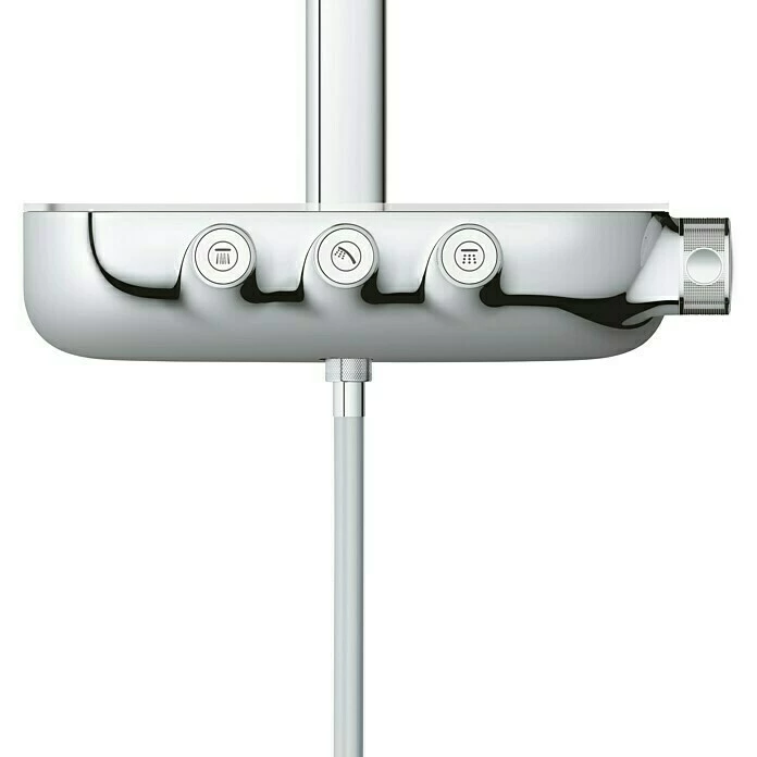 Das Duschsystem Rainshower SmarControl 360 von Grohe ist ein luxuriöses Duschsystem mit einfacher Bedienung und dreifacher Massage. Mit der neuartigen SmartControl Bedienung können Sie per Druck- und Drehknopf die gewünschte Brause, Strahlart und Wassermenge ganz einfach einstellen und sogar kombinieren. Zur Auswahl stehen jeweils zwei Strahlarten für Kopf- und Handbrause. So ist z. B. der Grohe TrioMassage Strahl der XXL-Kopfbrause entspannend und stimulierend zugleich. Auch in puncto Sicherheit lässt das System keine Wünsche offen: Die Grohe TurboStat® Technologie verhindert Temperaturschwankungen, die SafeStop Sperre schützt vor zu heißem Wasser und Grohe CoolTouch® sorgt dafür, dass die Armatur sich nicht aufheizt. Aber nicht nur Ihre empfindliche Haut, auch die Umwelt wird geschont: Die integrierte Grohe EcoJoy® Wasserspar-Funktion macht’s möglich! Diese und weitere praktische Funktionen sind eingebettet in ein formvollendetes Design.