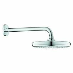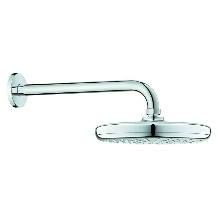 Das Kopfbrausenset Tempesta 210 von Grohe überzeugt durch ihre praktischen Eigenschaften. Sie bietet eine Strahlart, wobei das integrierte SpeedClean Antikalk-System lästige Kalkablagerungen effektiv verhindert. Die Grohe DreamSpray® Technologie verteilt auf jede einzelne Düse die gleiche Wassermenge und erzeugt so einen angenehm gleichmäßigen Strahl. Dank des Kugelgelenks ist sie auch nach der Montage, die einfach und schnell durch Anschrauben an den Arm erfolgt, schwenkbar und kann so jederzeit den eigenen Bedürfnissen angepasst werden. Die Grohe StarLight® Chrombeschichtung schützt den Brausekopf optimal und erfordert kaum Pflege.