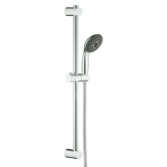 Mit der Brausegarnitur Vitalio Start 100 von Grohe entscheiden Sie sich für eine Handbrause inklusive Brausestange und Wandhaltern aus Metall. Zu den komfortablen Extras der Handbrause gehören drei verschiedene Strahlarten – Rain O², Rain, Massagestrahl, zwischen denen Sie einfach wechseln können. Der Grohe DreamSpray® verteilt auf jede einzelne Düse die gleiche Wassermenge und erzeugt so einen angenehm gleichmäßigen Strahl. Lästige Kalkablagerungen werden durch das integrierte SpeedClean Antikalk-System effektiv verhindert. Der ShockProof Silikonring am Kopf schützt vor Beschädigung durch Herunterfallen der Brause. Auch das Stangenset überzeugt durch besonderen Komfort: Dank Grohe QuickFix Plus geht die Montage kinderleicht. Mit den flexiblen Wandhaltern können Sie den Abstand der Bohrlöcher für die Duschstange selbst bestimmen und vorhandene Bohrlöcher oder die Fugen nutzen. Dieses Set ist damit von der ersten Sekunde an eine Bereicherung für Ihr Bad.