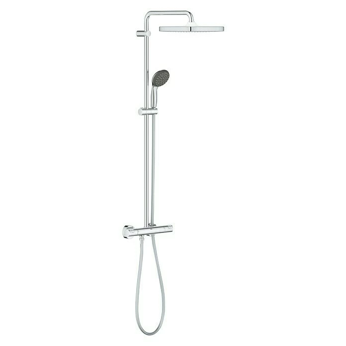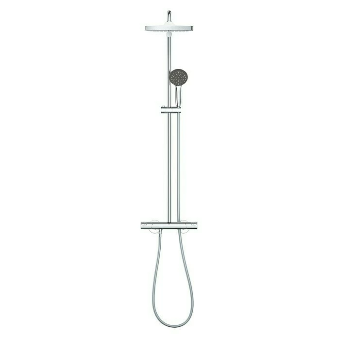 Das Duschsystem Vitalio Start Typ 2 von Grohe ist mit Kopfbrause, Handbrause und komfortabler Thermostatarmatur ein modernes Komplettsystem aus einem Guss. Die belebende Kopfbrause mit 25 cm Durchmesser lässt sich dank des schwenkbaren Duscharms zu beiden Seiten bewegen und mittels Kugelgelenk um 10 Grad in jede Richtung kippen. Sowohl Kopf- als auch Handbrause sind mit EcoJoy-Wasserspartechnik ausgestattet, was den Wasserverbrauch um bis zu 50 % reduziert – ohne jeglichen Komfortverlust. Dank der SpeedClean Antikalk-Noppen lassen sich Kalkablagerungen jederzeit durch simples Reiben mühelos entfernen. DreamSpray sorgt im Inneren beider Brausen für eine gleichmäßige Wasserverteilung auf jede einzelne Düse. Die höhenverstellbare Handbrause mit zwei wählbaren Strahlarten ist mit einem Silikonring ausgerüstet, der vor Beschädigungen beim Herunterfallen schützt und dank eines Verdrehschutzes bleibt der Brauseschlauch stets in einer ergonomisch günstigen Position. Die StarLight Chromoberfläche liefert langlebigen Hochglanz und erweist sich zudem als besonders widerstandsfähig gegen Schmutz und Kratzer.