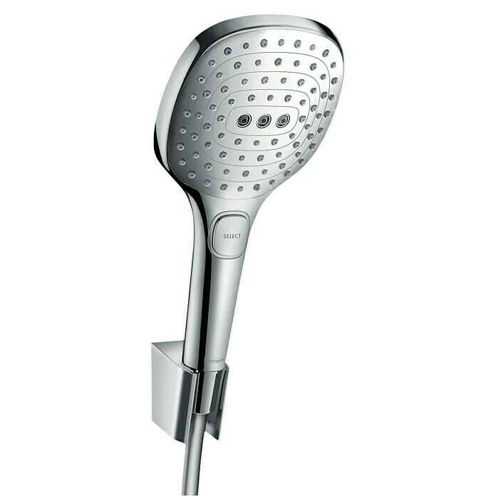 Das Brause-Set von Hansgrohe enthält eine Handbrause der Reihe Raindance Select E 120 sowie einen Brauseschlauch und einen Wandhalter aus Kunststoff. Es überzeugt durch sein klares, modernes und elegantes Design. Die innovative Select-Technologie ermöglicht ein bequemes Umschalten zwischen drei verschiedenen Strahlarten auf Knopfdruck. AirPower senkt den Wasserbedarf, indem das Wasser mit Luft vermischt wird. So fühlt sich der Strahl zudem weicher, leichter und fülliger an. Mit der Quick-Clean Funktion verschwinden lästige Kalkablagerungen im Handumdrehen: Rückstände können von den flexiblen Anti-Kalk-Noppen einfach abgerubbelt werden. Darüber hinaus wird mit dem an der Handbrause integrierten Drehwirbel ein Verdrehen des Brauseschlauches verhindert, was für uneingeschränktes Duschvergnügen sorgt.