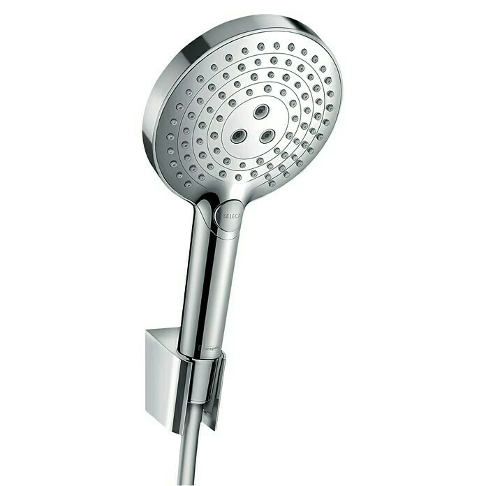 Das Brause-Set von Hansgrohe enthält eine Handbrause der Reihe Raindance Select S 120 sowie einen Brauseschlauch und einen Wandhalter aus Kunststoff. Es überzeugt durch sein klares, modernes und elegantes Design. Die innovative Select-Technologie ermöglicht ein bequemes Umschalten zwischen drei verschiedenen Strahlarten auf Knopfdruck. AirPower senkt den Wasserbedarf, indem das Wasser mit Luft vermischt wird. So fühlt sich der Strahl zudem weicher, leichter und fülliger an. Mit der Quick-Clean Funktion verschwinden lästige Kalkablagerungen im Handumdrehen: Rückstände können von den flexiblen Anti-Kalk-Noppen einfach abgerubbelt werden. Darüber hinaus wird mit dem an der Handbrause integrierten Drehwirbel ein Verdrehen des Brauseschlauches verhindert, was für uneingeschränktes Duschvergnügen sorgt.