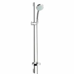 Die Brausegarnitur von Hansgrohe enthält eine Handbrause der Reihe Croma 100 Vario sowie einen Brauseschlauch, eine Brausestange, eine Seifenschale und Wandhalter aus Kunststoff. Sie überzeugt durch ein sehr elegantes und modernes Gesamtbild mit harmonisch aufeinander abgestimmten Elementen. Über die drehbare Strahlscheibe können vier verschiedene Strahlarten angewählt werden. Dank der Quick-Clean Funktion verschwinden lästige Kalkablagerungen im Handumdrehen: Rückstände können von den flexiblen Anti-Kalk-Noppen einfach abgerubbelt werden. Der höhenverstellbare Schieber ist schwenkbar sowie um 90° im Winkel verstellbar. Mit dem an der Handbrause integrierten Drehwirbel wird ein Verdrehen des Brauseschlauches verhindert, was für uneingeschränktes Duschvergnügen sorgt.