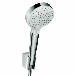 Das Brause-Set von Hansgrohe enthält eine Handbrause der Reihe Crometta Vario sowie einen Brauseschlauch und einen Wandhalter aus Kunststoff. Über die drehbare Strahlscheibe können zwei verschiedene Strahlarten angewählt werden. Dank der Quick-Clean Funktion verschwinden lästige Kalkablagerungen im Handumdrehen: Rückstände können von den flexiblen Anti-Kalk-Noppen einfach abgerubbelt werden. Mit dem an der Handbrause integrierten Drehwirbel wird ein Verdrehen des Brauseschlauches verhindert, was für uneingeschränktes Duschvergnügen sorgt.