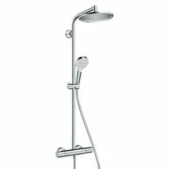 Das Überkopfbrause-Set Showerpipe Crometta S 240 Vario von Hansgrohe sorgt für mehr Spaß, Wohbefinden und Komfort in der Dusche. Das Set besteht aus einer Thermostatarmatur, einer Brausestange, einer Kopf- und Handbrause sowie einem Brauseschlauch. Die funktionale und beständige Thermostatarmatur verfügt über die neueste Technologie mit der sich Wasser und Temperatur besonders leicht und präzise einstellen lässt. Die bei 40 °C positionierte Sicherheitssperre schützt insbesondere Kinder davor, die Temperatur versehentlich zu heiß einzustellen. Die verchromte Handbrause liefert auf Wunsch zwei verschiedene Strahlarten. Die Strahlarten lassen sich über eine drehbare Strahlscheibe umstellen. Mit der Quick-Clean Funktion verschwinden Rückstände im Handumdrehen. Lästige Kalkablagerungen werden aufgrund der integrierten Anti-Kalknoppen effektiv verhindert und durch Reiben der Noppen gelöst.