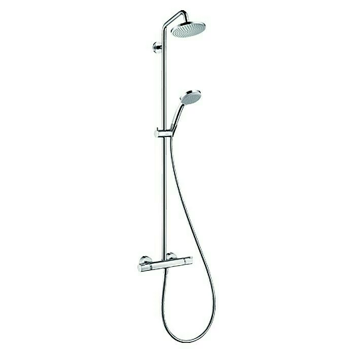 Mit dem Überkopfbrause-Set Croma Showerpipe 160 von Hansgrohe sorgen Sie ohne aufwändige Umbauarbeiten ganz schnell für mehr Entspannung im Bad. Das Überkopfbrauseset bietet als komfortable Komplettlösung alles Notwendige für Ihre Dusche. Mit Hilfe der Kopfbrause wird das Wasser gleichmäßig verteilt und regenweiches Duschen ermöglicht. Die funktionale und beständige Thermostatarmatur verfügt über die neueste Technologie mit der sich Wasser und Temperatur besonders leicht und präzise einstellen lässt. Die Handbrause bietet mit ihren 4 verstellbaren Strahlarten zusätzlichen Komfort und setzt einen modischen Akzent. Der Isiflex Brauseschlauch in Metalloptik ist 170 cm lang und aus hochwertigen Kunststoff gefertigt. Die reinigungsfreundliche Kunsstoffhülle ist mit einem brauseseitigen Drehwirbel ausgestattet und verhindert lästiges Verdrehen des Schlauches.