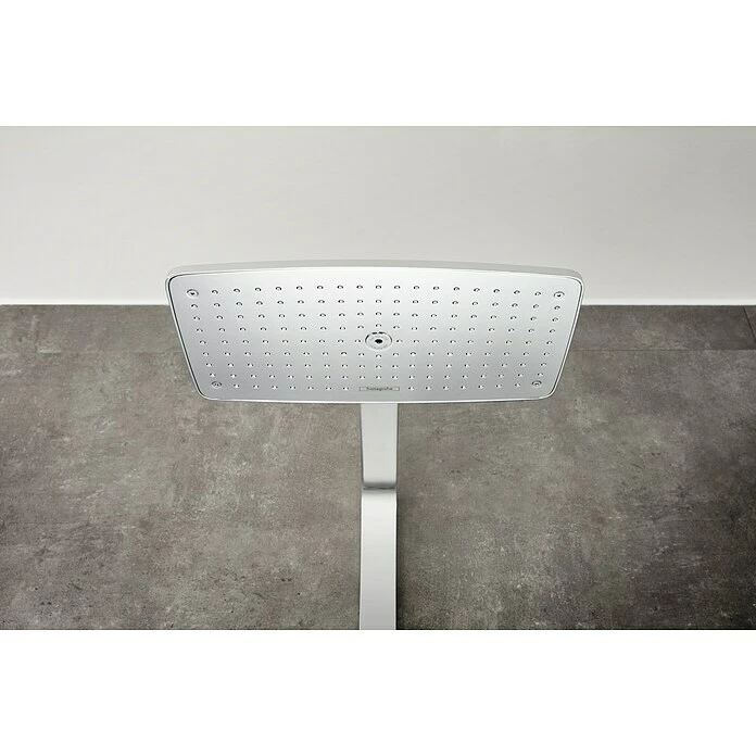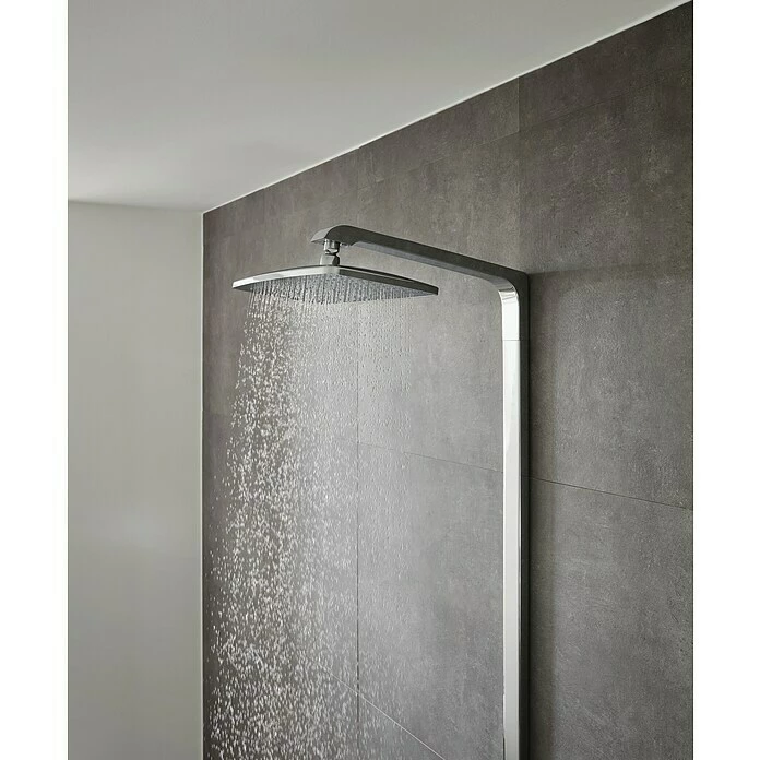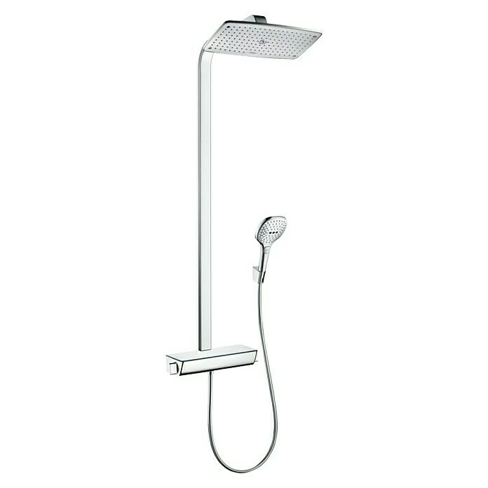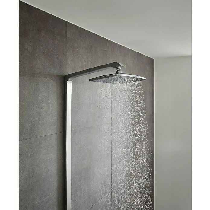 Das Überkopfbrause-Set Raindance E Showerpipe 360 von Hansgrohe macht die Dusche zur Wohlfül-Oase. Das Set besteht aus einer Thermostatarmatur, einer Brausestange, einem Brauseschlauch, einer Kopfbrause Raindance E 360 Air sowie einer Handbrause Raindance Select E 120. Das Ecostat Select-Thermostat bleibt dank der CoolContact-Bauweise auch bei Heißwassernutzung immer angenehm kühl und erhöht so die Sicherheit für Sie und Ihre Kinder. Mit seiner großzügigen Ablagefläche aus Sicherheitsglas bietet es darüber hinaus reichlich Platz für Dusch-Utensilien. Die Sicherheitssperre sorgt dafür, dass die Wassertemperatur nicht über 40°C ansteigt, was sich jederzeit auch während des Duschens wieder aufheben lässt. Die extragroße Kopfbrause verfügt über eine Strahlart, an der Handbrause kann über die Select-Taste zwischen drei verschiedenen Strahlarten gewählt werden. Durch die AirPower-Technologie wird das Wasser mit Luft vermischt, wodurch sich der Strahl weicher, leichter und fülliger anfühlt. Die QuickClean-Funktion ermöglicht dank flexibler Silikonnoppen eine kinderleichte Entkalkung: Kalkablagerungen werden einfach abgerubbelt. Mit dem an der Handbrause integrierten Drehwirbel wird ein Verdrehen des Brauseschlauches verhindert. Der Brausearm verfügt über ein Kugelgelenk, wodurch die Kopfbrause im Winkel frei verstellt werden kann – uneingeschränktes Duschvergnügen garantiert.