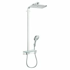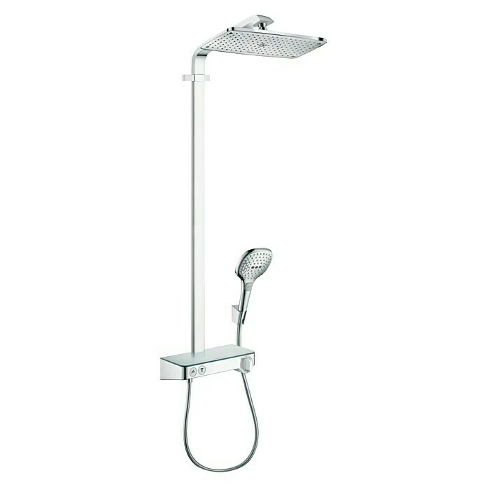Das Überkopfbrause-Set Raindance E Showerpipe 360 von Hansgrohe macht die Dusche zur Wohlfül-Oase. Das Set besteht aus einer Thermostatarmatur, einer Brausestange, einem Brauseschlauch, einer Kopfbrause Raindance E 360 Air sowie einer Handbrause Raindance Select E 120. Das ShowerTablet Select 300-Thermostat bleibt dank der CoolContact-Bauweise auch bei Heißwassernutzung immer angenehm kühl und erhöht so die Sicherheit für Sie und Ihre Kinder. Über die Select-Tasten werden Kopf- oder Handbrause angewählt. Mit seiner großzügigen Ablagefläche aus Sicherheitsglas bietet es darüber hinaus reichlich Platz für Dusch-Utensilien. Die Sicherheitssperre sorgt dafür, dass die Wassertemperatur nicht über 40°C ansteigt, was sich jederzeit auch während des Duschens wieder aufheben lässt. Die extragroße Kopfbrause verfügt über eine Strahlart, an der Handbrause kann ebenfalls mittels Select-Taste zwischen drei verschiedenen Strahlarten gewählt werden. Durch die AirPower-Technologie wird das Wasser mit Luft vermischt, wodurch sich der Strahl weicher, leichter und fülliger anfühlt. Die QuickClean-Funktion ermöglicht dank flexibler Silikonnoppen eine kinderleichte Entkalkung: Kalkablagerungen werden einfach abgerubbelt. Mit dem an der Handbrause integrierten Drehwirbel wird ein Verdrehen des Brauseschlauches verhindert. Der Brausearm verfügt über ein Kugelgelenk, wodurch die Kopfbrause im Winkel frei verstellt werden kann – uneingeschränktes Duschvergnügen garantiert.