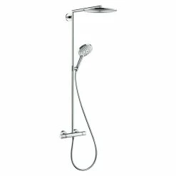 Das Überkopfbrause-Set Raindance S Showerpipe 300 von Hansgrohe macht die Dusche zur Wohlfül-Oase. Das Set besteht aus einer Thermostatarmatur, einer Brausestange, einem Brauseschlauch, einer Kopfbrause Raindance S 300 Air sowie einer Handbrause Raindance Select S 120. Das Ecostat Comfort-Thermostat kann mit seinem eleganten, abgerundeten Design und den besonders ergonomisch geformten Metallgriffen technisch wie optisch überzeugen. Die Sicherheitssperre sorgt dafür, dass die Wassertemperatur nicht über 40°C ansteigt, was sich jederzeit auch während des Duschens wieder aufheben lässt. Die extragroße Kopfbrause verfügt über eine Strahlart, an der Handbrause kann über die Select-Taste zwischen drei verschiedenen Strahlarten gewählt werden. Durch die AirPower-Technologie wird das Wasser mit Luft vermischt, wodurch sich der Strahl weicher, leichter und fülliger anfühlt. Die QuickClean-Funktion ermöglicht dank flexibler Silikonnoppen eine kinderleichte Entkalkung: Kalkablagerungen werden einfach abgerubbelt. Mit dem an der Handbrause integrierten Drehwirbel wird ein Verdrehen des Brauseschlauches verhindert. Der Brausearm ist schwenkbar, wodurch die Kopfbrause individuell positioniert werden kann – uneingeschränktes Duschvergnügen garantiert.